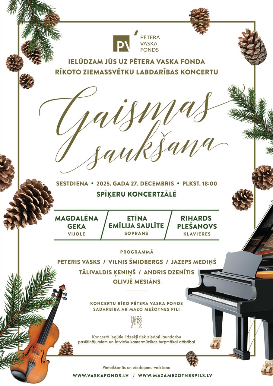 Kā ierasts, arī šogad laikā starp Ziemassvētkiem un Jauno gadu – 27.decembrī – Spīķeru koncertzālē izskanēs Pētera Vaska fonda rīkotais tradicionālais Ziemassvētku labdarības koncerts “Gaismas saukšana”. Koncerta sākums – plkst.18.